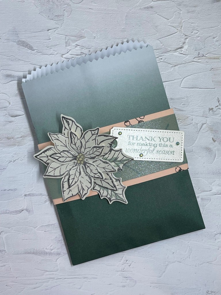 An In Color Ombre gift bag dressed up in Poinsettia Petals with embossing – Images (c) Stampin’ Up! 2020-2021