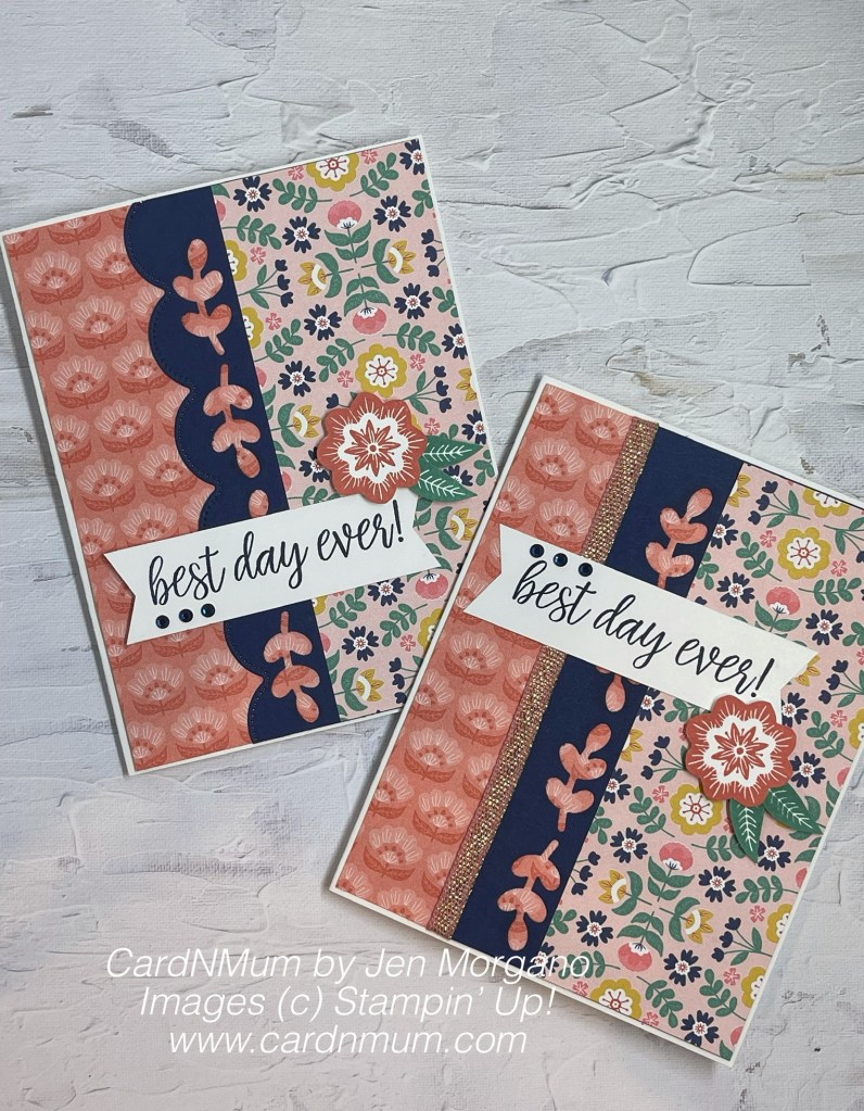 I punched out two sets of sprigs using the In Symmetry punch along one edge of the Night of Navy. You can see each card has a slightly different take – I used the scalloped edge thinlit from the Scalloped Contour dies on one piece of Night of Navy. On this card, I adhered the larger piece of DSP to the cardbase, then the Night of Navy to that along the right edge, and then the smaller piece of DSP along the right edge of that.