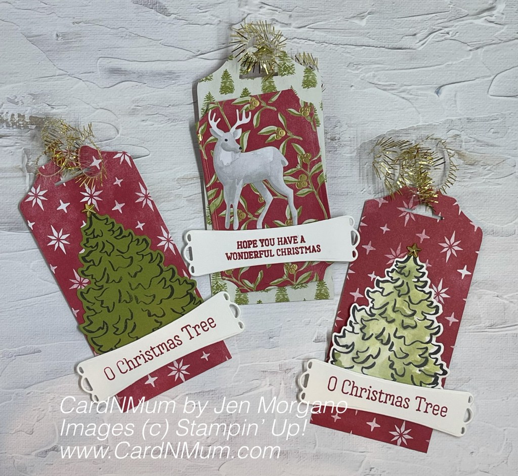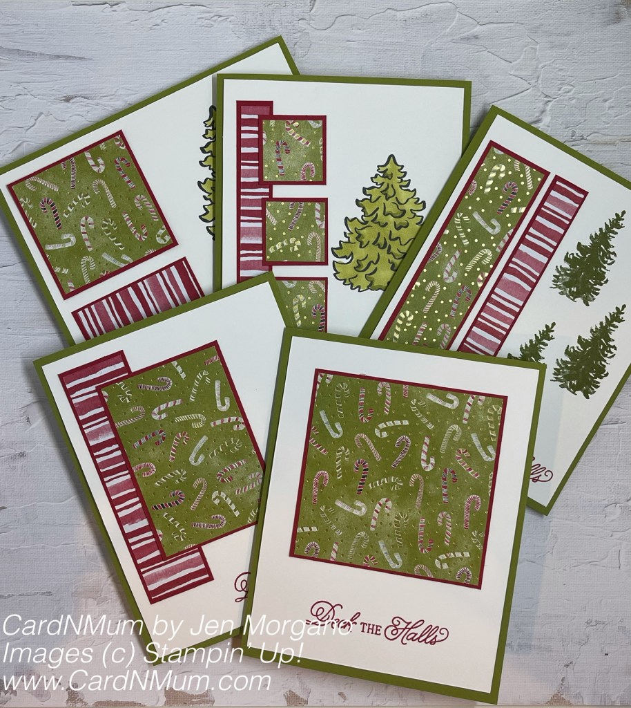 The cards above are made with the retired Most Wonderful Time Product Medley – which is still currently available and on clearance (for $42!!). This is a steal for anyone who wants to jump into your holiday card/tag making during what is turning out to be one brutally hot summer so far.