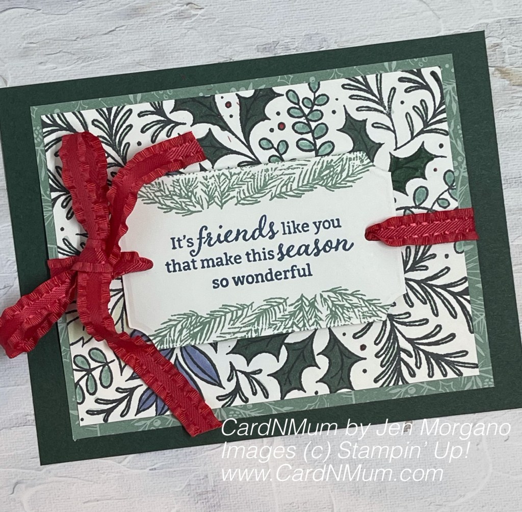 In my second card using Festive Foliage, I used my Stampin’ Blends to color in that gorgeous stamp and added a pop of red with the ruffled ribbon available in the new mini catalog: