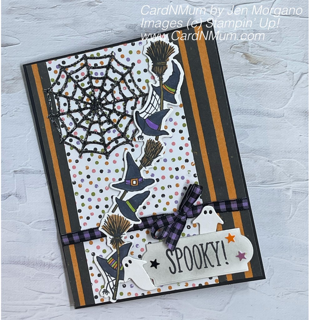 Using a longer scrap of Basic White card stock, I stamped/die cut the witch hat/broom stamp from the Festive& Bright set. I colored using Stampin’ Blends (they are so forgiving and my coloring tool of choice, for sure). I adhered to the DSP on a diagonal using Stampin’ Dimensionals. After coloring the Be Dazzling DSP and die cutting the spider web from that piece, I adhered in the upper left corner of the card using glue.