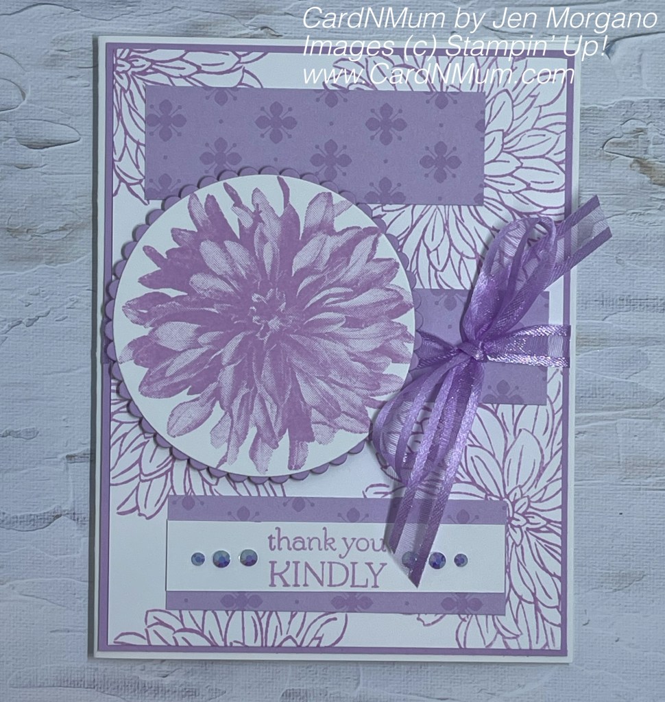 The Delicate Dahlias photopolymer stamp set is one of the free items you can earn during Sale-a-Bration. It has both outline stamps and realistic style stamps. You can use them together to make a layered look – I chose to use them separately.
