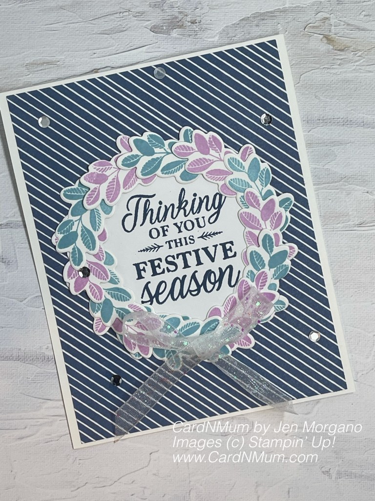 I gave you a Merriest Moments card in traditional colors – so I have to give you one in non-traditional colors, right? A Fresh Freesia and Balmy Blue wreath surround the sentiment over a Misty Moonlight background. A few shimmery additions complete the card.