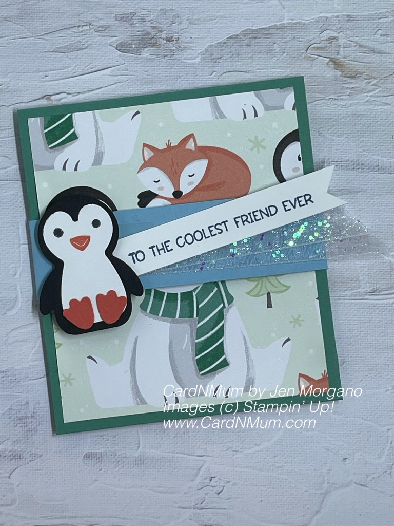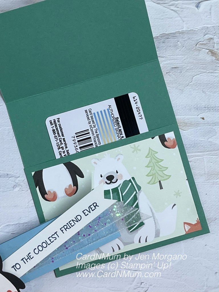 Whenever I need a gift card holder, this is my go-to design. It’s quick, fits a gift card perfectly, and can be decorated any which way you like. And bonus, you can get 3 out of one sheet of 8 1/2″ x 11″ cardstock. I used the Penguin Place bundle with the coordinating Penguin Playmate DSP (available free with a $50 purchase through the end of September).