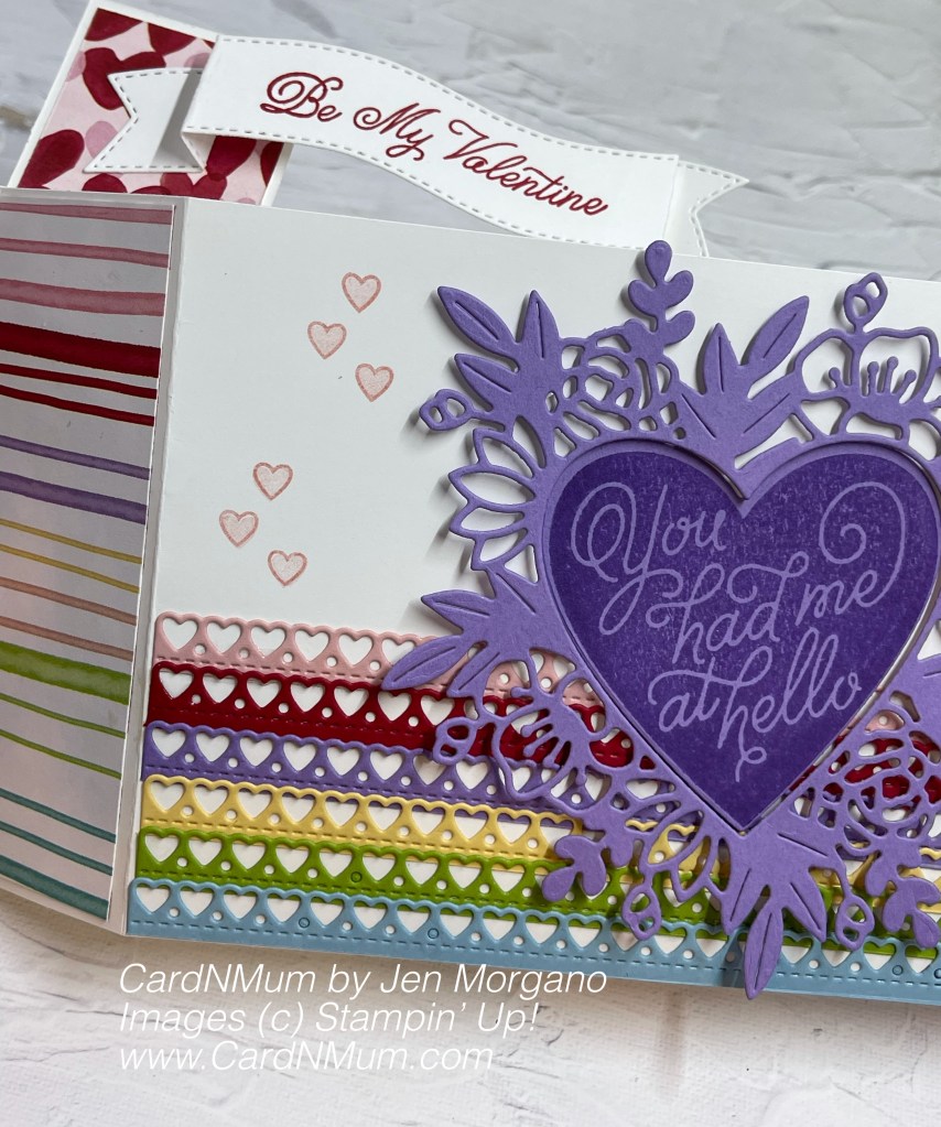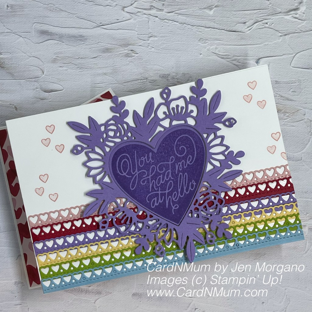 I paired up some of the new Sweet Talk Designer Series Paper with a set that carried over from last year’s January-June mini catalog – the Always in My Heart stamp set and the Floral Heart dies – they are so pretty. I livened the card up with a nice heart rainbow strip along the bottom.