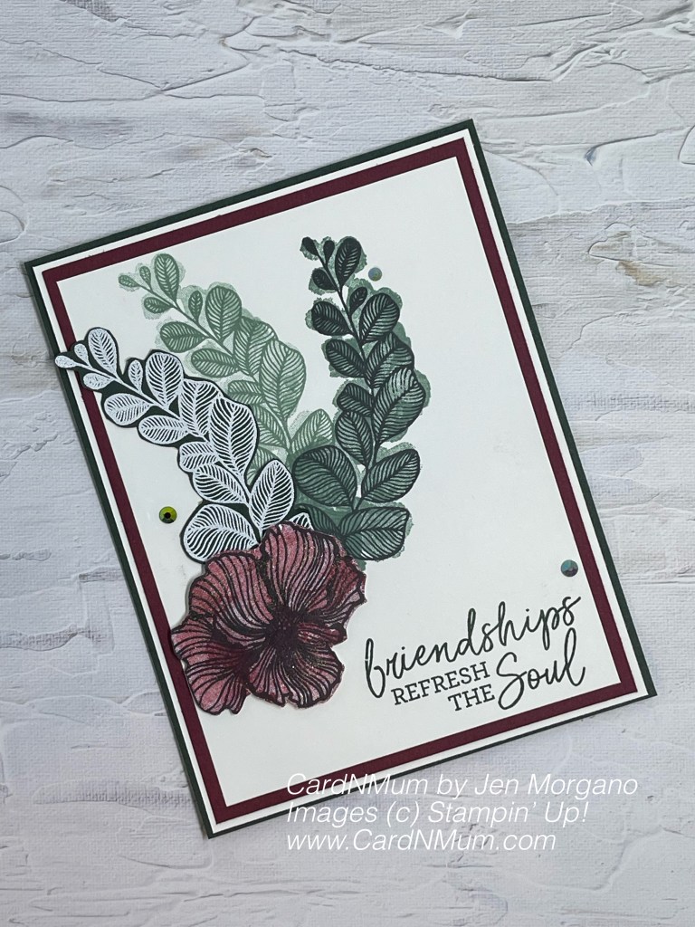 The card base of Evening Evergreen is 4 1/4″ x 11″ – scored at 5 1/2″ along the long side. The first layer of Basic White is 4 1/8″ x 5 3/8″; the Merry Merlot layer is 4″ x 5 1/4″; and the second layer of Basic White is 3 3/4″ x 4 3/4″. I adhered the embossed leaf image with multipurpose glue and the flower with Dimensionals. I stamped the sentiment (from Beauty of Friendship) in Evening Evergreen in the lower right corner. I added a few 2021-2023 In Color Jewels to finish the card off.