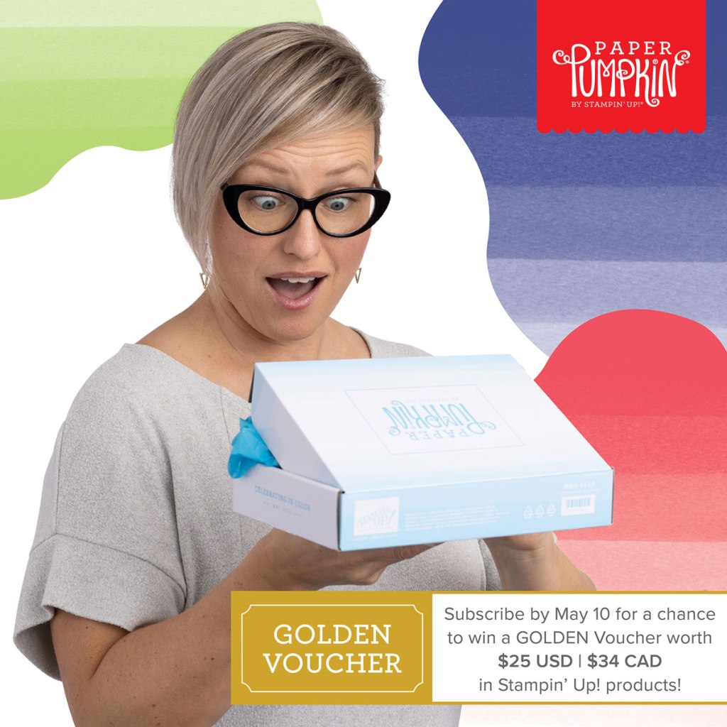 May’s Paper Pumpkin sounds fantastic! Not only will it incorporate all of the new In Colors – but Stampin’ Up! will randomly put “Golden Vouchers” in certain boxes. These Golden Vouchers will be worth 25 dollars in free products. How awesome is that!!