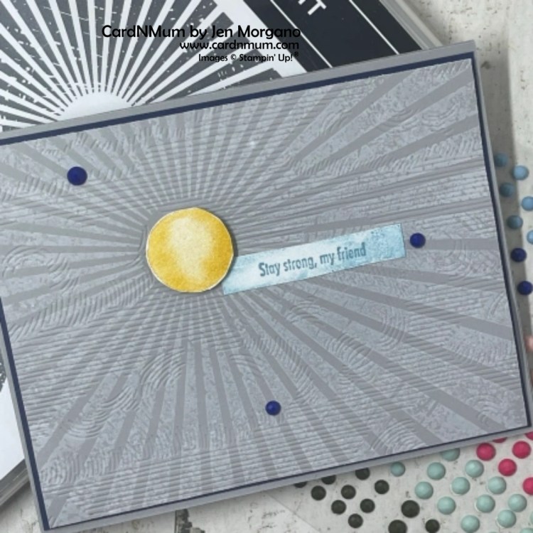 - Using liquid glue, adhere the sentiment piece near the ‘open circle’ of the Rays of Light image. Then adhere your ‘sun’ using a Stampin’ Dimensional.