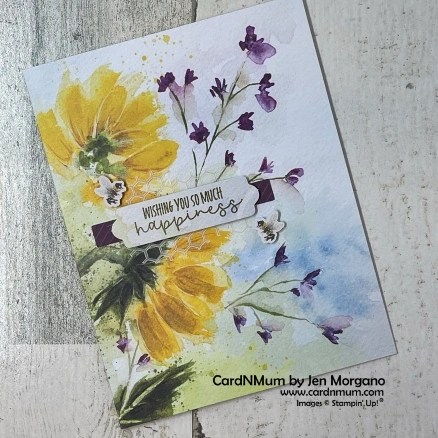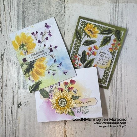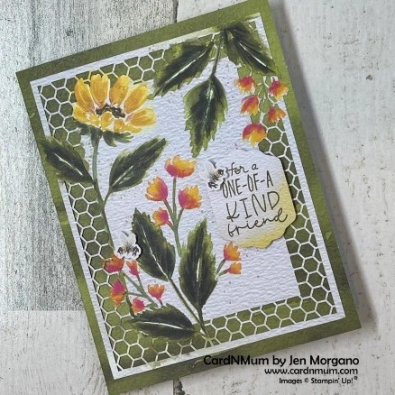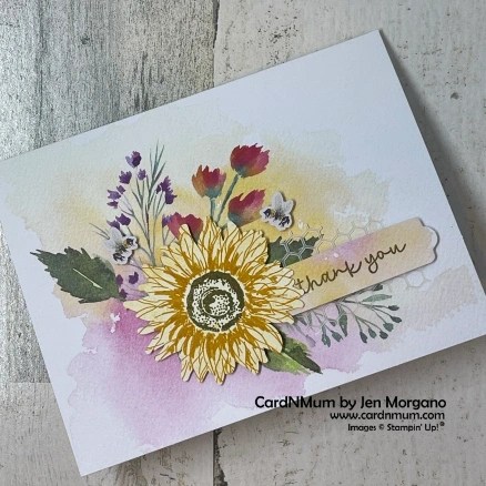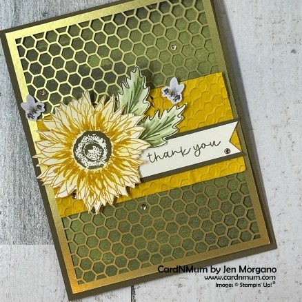 I adhered the sentiment to the bottom portion of the crumpled Crushed Curry with Tear & Tape. I adhered the sunflower using Stampin’ Dimensionals and the leaves with Mini Glue Dots. I added a few bumblebees from the kit and some extra Champagne Rhinestones from my stash. I love how it came out!!