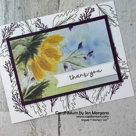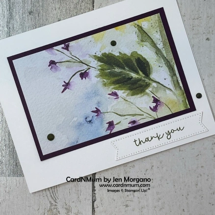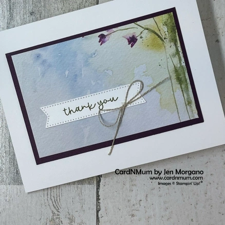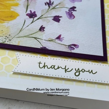I used a card base of Basic White – 4 1/4″ by 11″, scored at 5 1/2″ along the long side and a matte of 3″ x 4 1/2″ of Blackberry Bliss card stock. I stamped the sentiment of Thank You in Blackberry Bliss ink on Basic White cardstock and cut those out using my favorite little banner from the Stylish Shapes dies.
