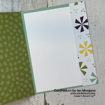 - Glue the large Basic White panel to the inside of the card and the 1” x 5 ½” of DSP on top of that along the right side