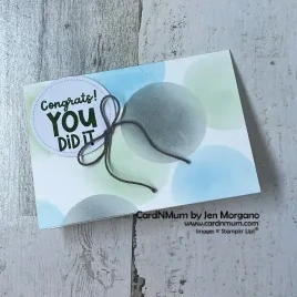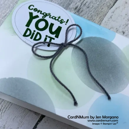 I used one of the negatives left over from the round sentiment cutout as a mask. I used Garden Green, Pacific Point and Basic Grey ink pads with a Blender Brush. Masking paper helped me make sure I didn’t go outside of the lines. I stamped the sentiment on a round cut out and adhered it with Stampin’ Dimensionals. A fun grey twine bow finished this alternative off. What do you think?