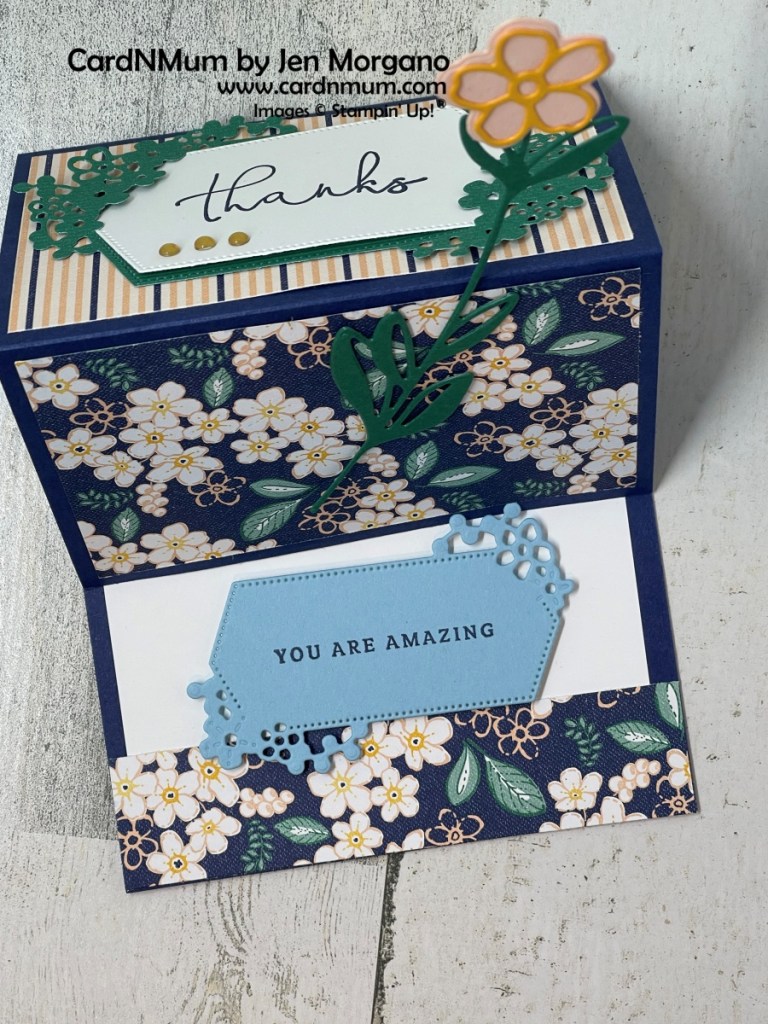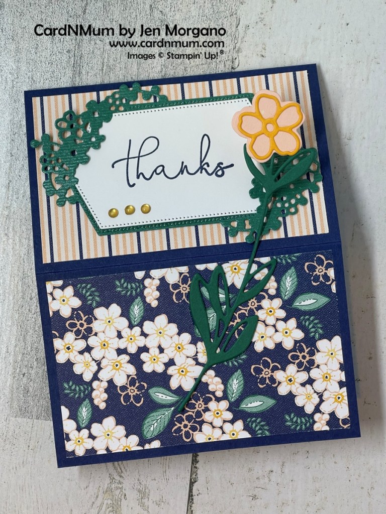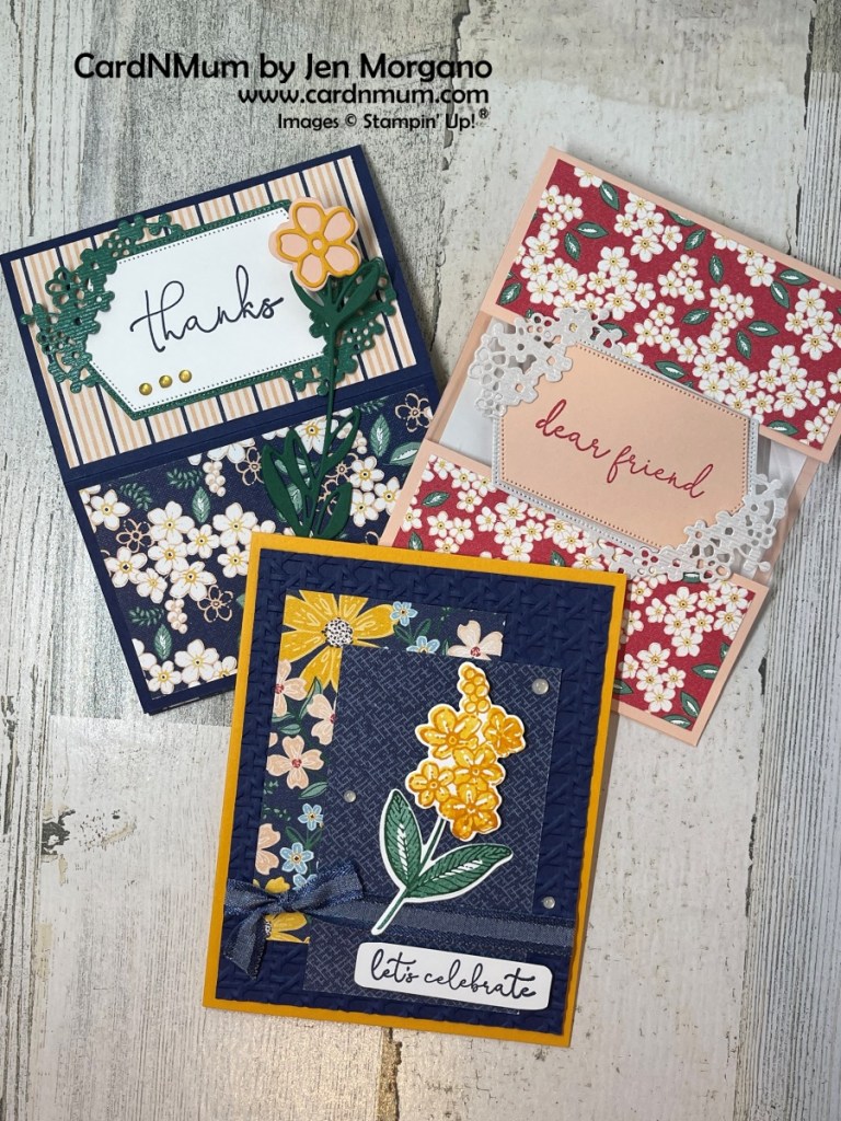 All the paper (including die-cut pieces) you’ll need to make the cards will be included in choices 2 through 4 but if you are curious – we’ll be using Night of Navy, Shaded Spruce, Mango Melody, Petal Pink, Balmy Blue, Regency Park 6” x 6” DSP, Textured 12”x 12” Shimmer Paper, and Window Sheets.