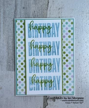 - Stamp the ‘happy’ in Granny Apple Green over the birthdays