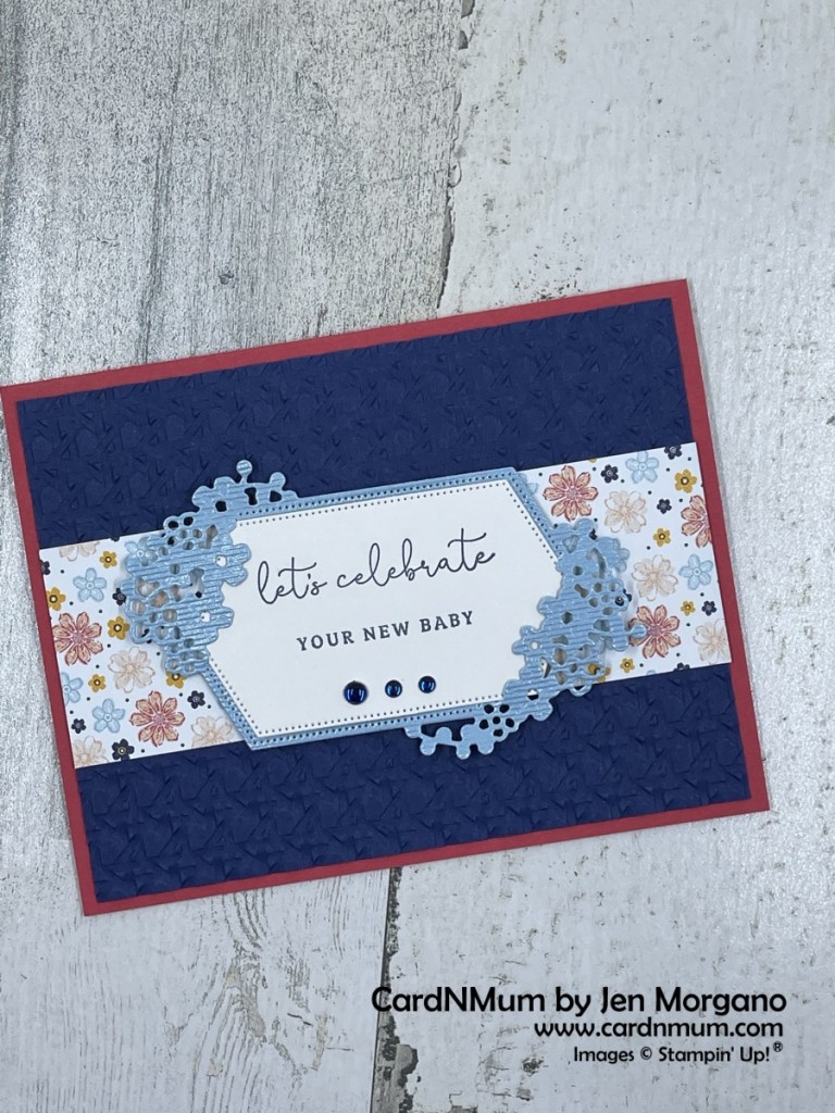 I started with a 4 1/4″ x 11″ piece of Sweet Sorbet cardstock (scored at 5 1/2″). I used a 4″ x 5 1/4″ layer of Night of Navy card stock – I embossed this piece using the Cane 3D Embossing Folder. I affixed a 1 1/2″ x 6″ of Regency Park Designer Series Paper to the middle of the Night of Navy piece and trimmed before adhering to the card front.