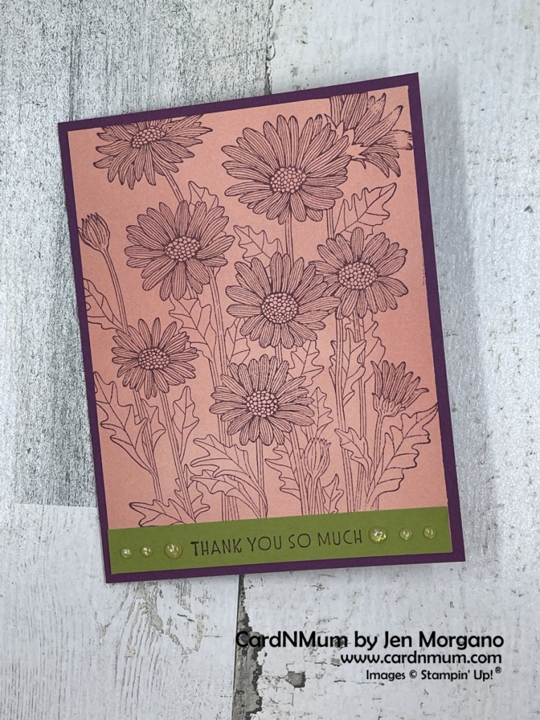 I used my Stamparatus and Rich Razzleberry ink to stamp the daisies on a piece of 4″ x 5 1/4″ DSP. I then adhered that to a Rich Razzleberry card base (5 1/2″ x 8 1/2″, scored at 4 1/4″ on the long side). I stamped my sentiment in Rich Razzleberry on a 1/2″ x 4″ piece of Old Olive and adhered it to the bottom of the daisy image. I added some 2021-2023 In Color Gems to either side of the sentiment.