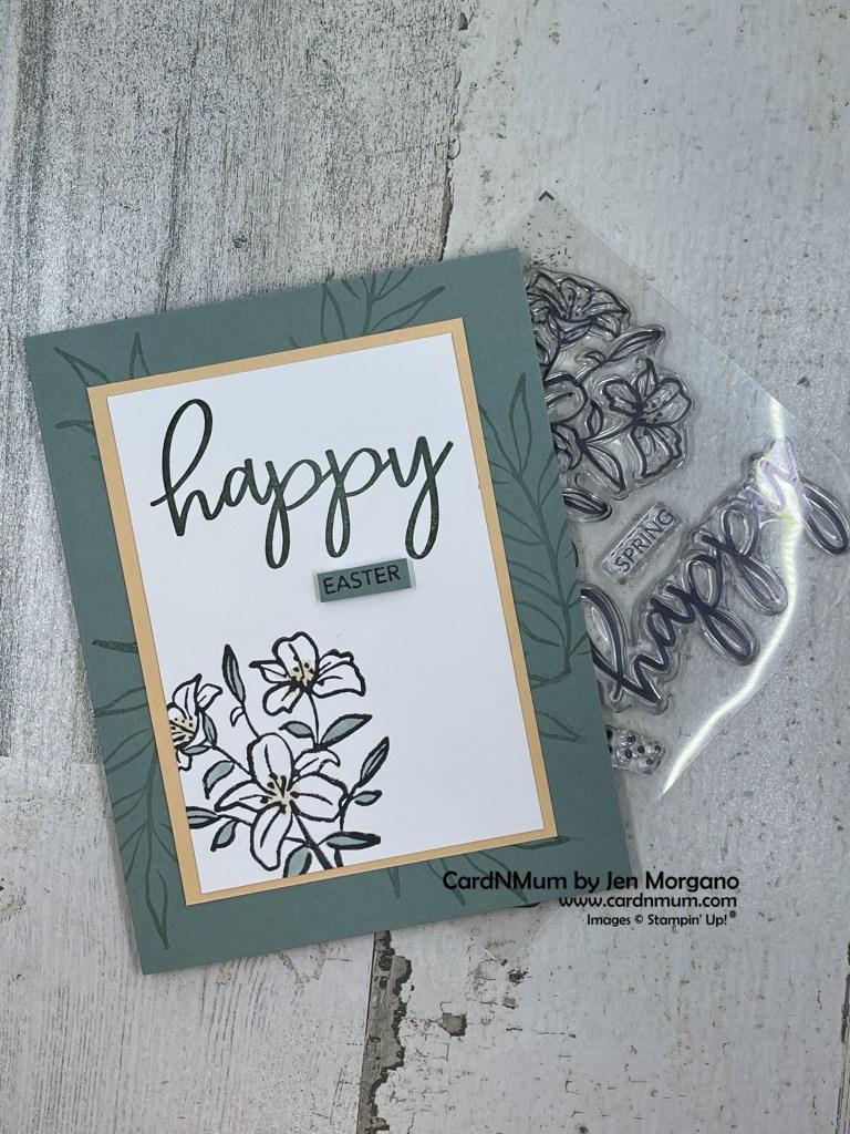 I stamped the larger leaf pattern in Soft Succulent on a Soft Succulent card base (5 1/2″ x 8 1/2″ folded at 4 1/4″ on the long side). On a piece of Basic White (3″ x 4 1/4″), I stamped ‘happy’ in Evening Evergreen and the lily image in Memento Tuxedo Black. I colored in the lily with Soft Succulent and Pale Papaya Stampin’ Blends. I stamped ‘Easter’ on a scrap of Soft Succulent in Tuxedo Black and trimmed very close.