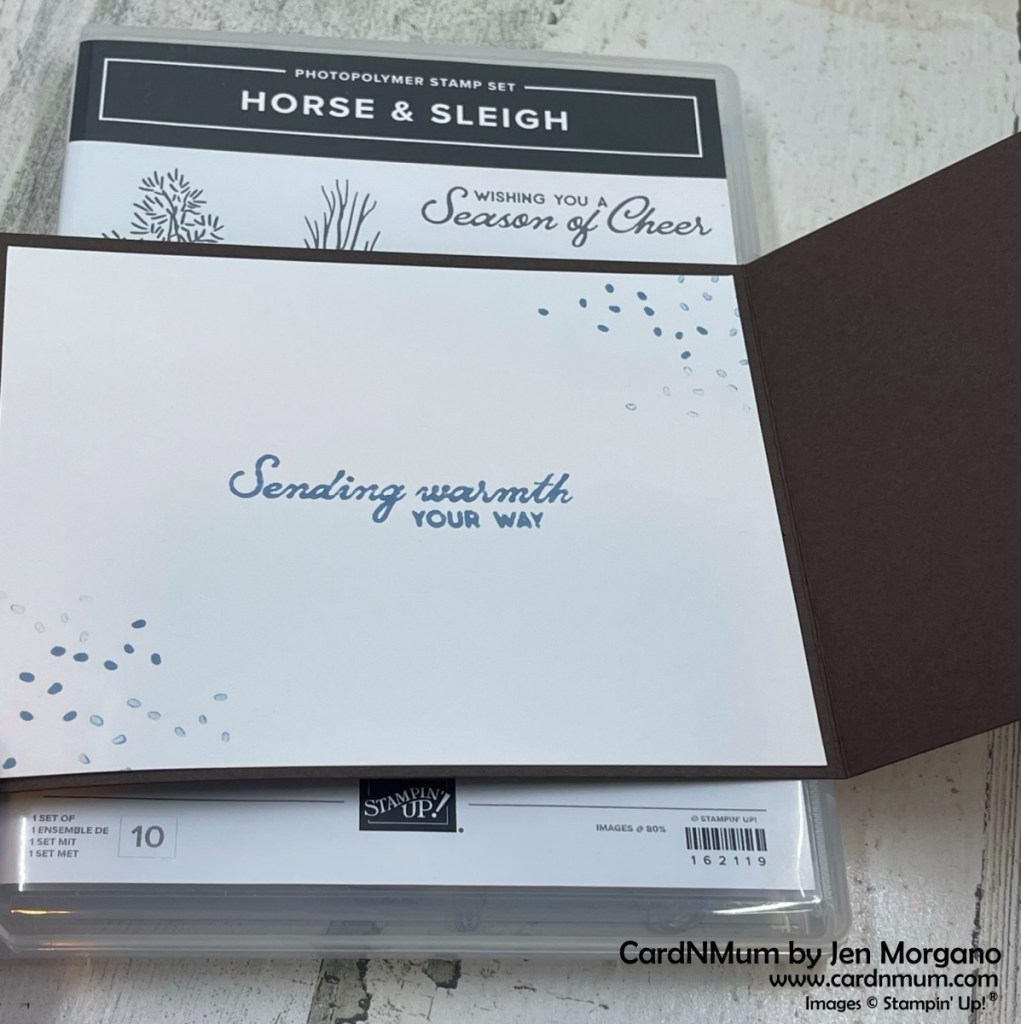 This was a fun card to make. It actually opens to the right and the horse and sleigh are attached to a window sheet piece that opens to the right.