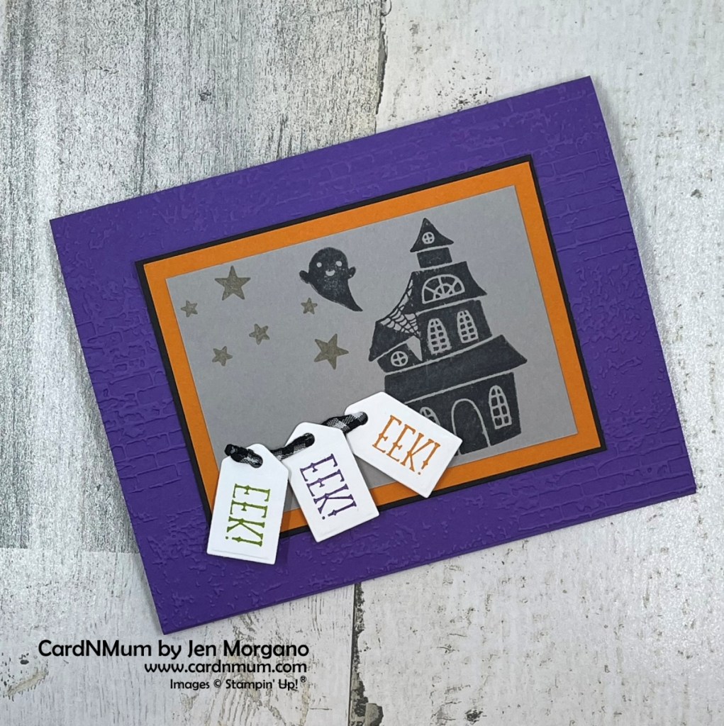 I stamped some “EEK!”s in Granny Apple Green, Gorgeous Grape, and Pumpkin Pie ink on scraps of Basic White and cute them out using the little tag die from the set.