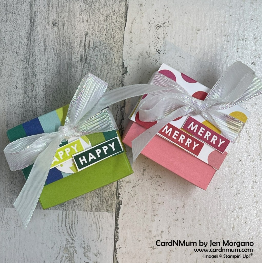 The base is made of cardstock (5 1/4″ x 4″) and the top is made of DSP (5 5/16″ x 4 1/16″) – score both pieces at 1 1/2″ on all sides. Burnish, cut, and assemble. I used about 20 inches of ribbon to tie around the top and finish with a bow. I stamped and fussy cut the sentiments which I attached using Dimensionals.