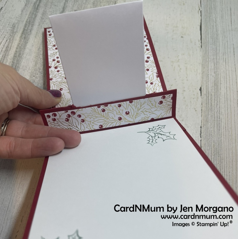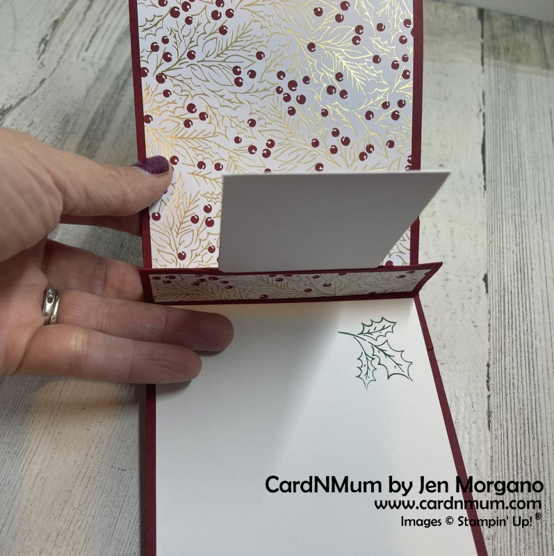 This card has a fun little pop-up in it’s crease that has a spot to slip in one of Stampin’ Up!’s Classic Gift Card Envelopes: