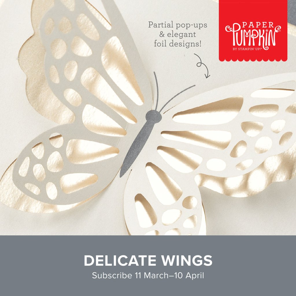 The subscription period for April’s Paper Pumpkin kit is open. It’s called Delicate Wings – here’s some more details: