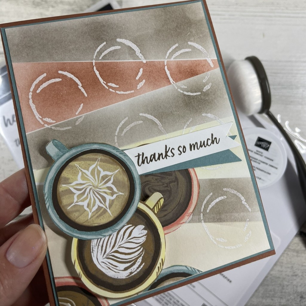 Those beautiful coffee images come from the DSP pack – you can fussy cut the images or use the coordinating dies. I also cut the corner images that weren’t full cups so that I didn’t waste anything.