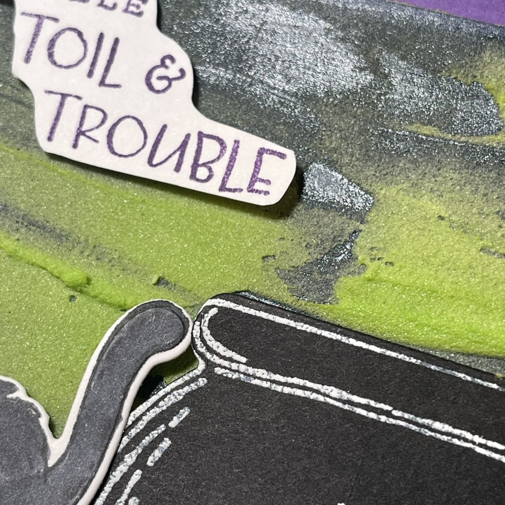 While that paste was drying, I heat embossed my cauldron. I used White ink and white powder so it really stood out on the black. I stamped my books, cat, bottle, and sentiment and cut them out (I fussy cut the sentiment). I colored in the books and cat using my favorite coloring tool – Stampin’ Blends!