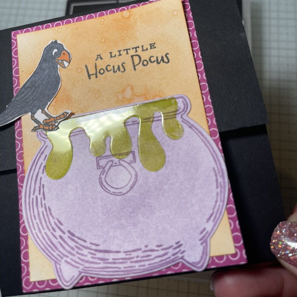 I also cut the ‘goo’ leaking out of the cauldron from a Window Sheet and colored it in using a Stampin’ Blend – I love how it looks.