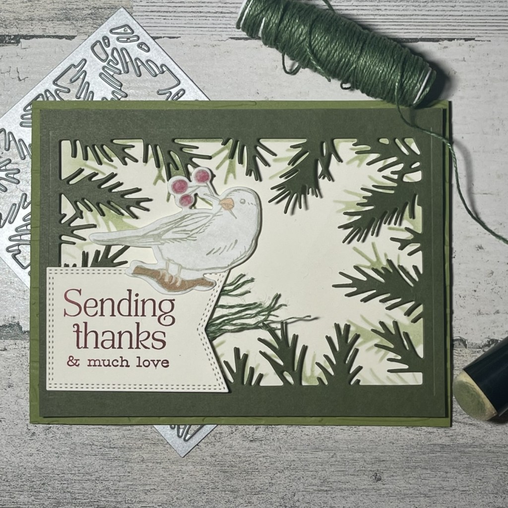 I colored in the branch, feet, beak, and berries using Stampin’ Blends and then lifted some color from the berries for a super muted look. I stamped my sentiment in Cherry Cobbler and cut it out using a die from the Nested Essentials dies. I finished the card with some frayed twine. I love that look.