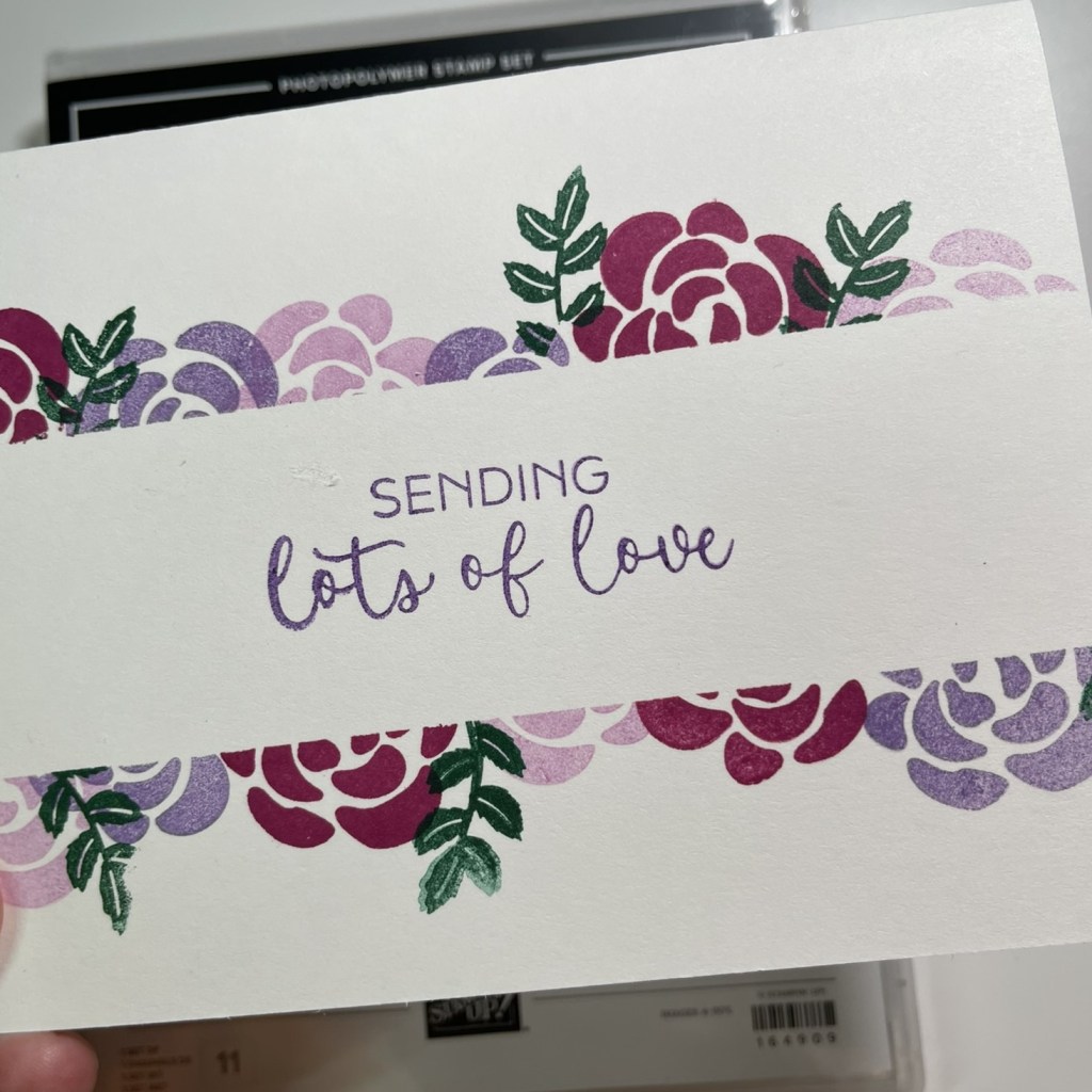 I simply placed the piece of masking paper on the card front and stamped the floral and stem images randomly over the paper. Give it a try – you’ll love the results.