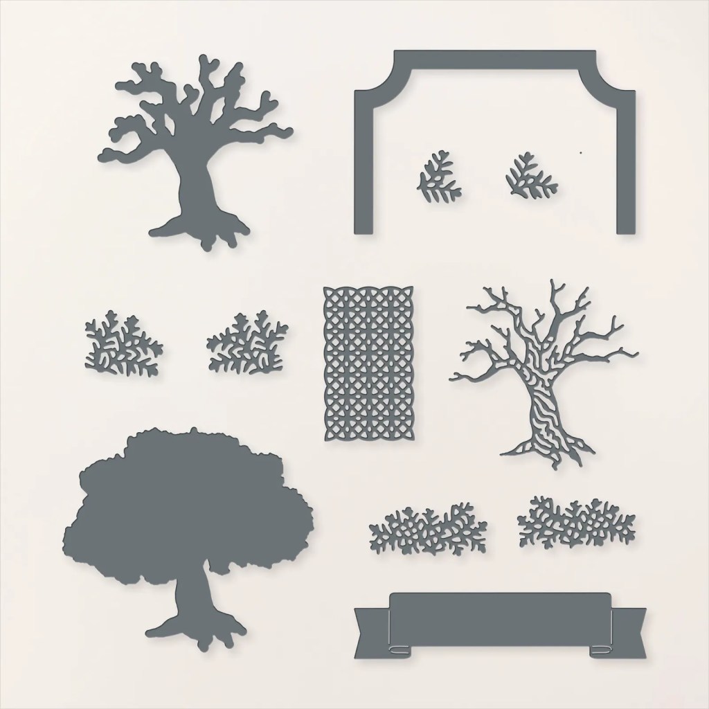I used a card base of Petal Pink (5 1/2″ x 8 1/2, scored at 4 1/4″). I cut the solid tree base out of Pecan Pie and the detailed tree overlay out of Early Espresso. The ‘leaf’ pieces are cut from Mossy Meadow. The banner is Calypso Coral – the sentiment is stamped in Early Espresso.