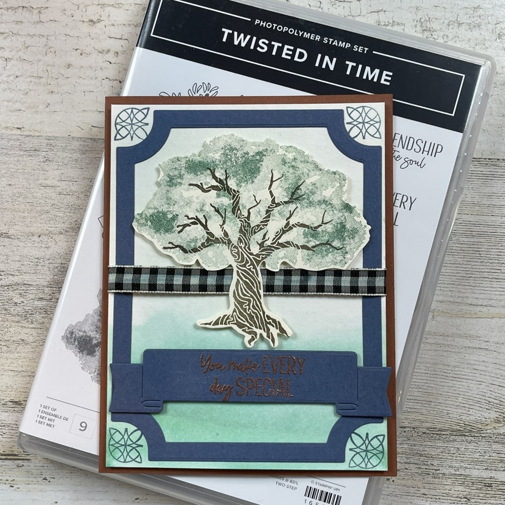 I am using the Twisted in Time bundle again today for this card. My first card was a little more simple and the second stepped it up a bit. I used a lot of different techniques for this card.