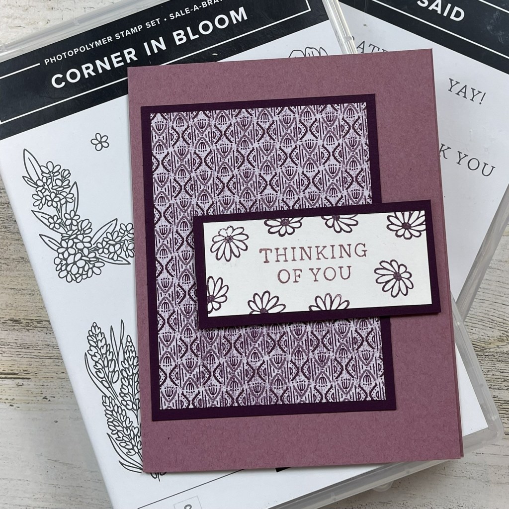 In all the excitement, sometimes the Annual Catalog gets a little lost. So I thought why not pair some items up. This week, I’ll be using the Sale-A-Bration stamp set, Corner in Bloom, with Simply Said (from the Annual Catalog).