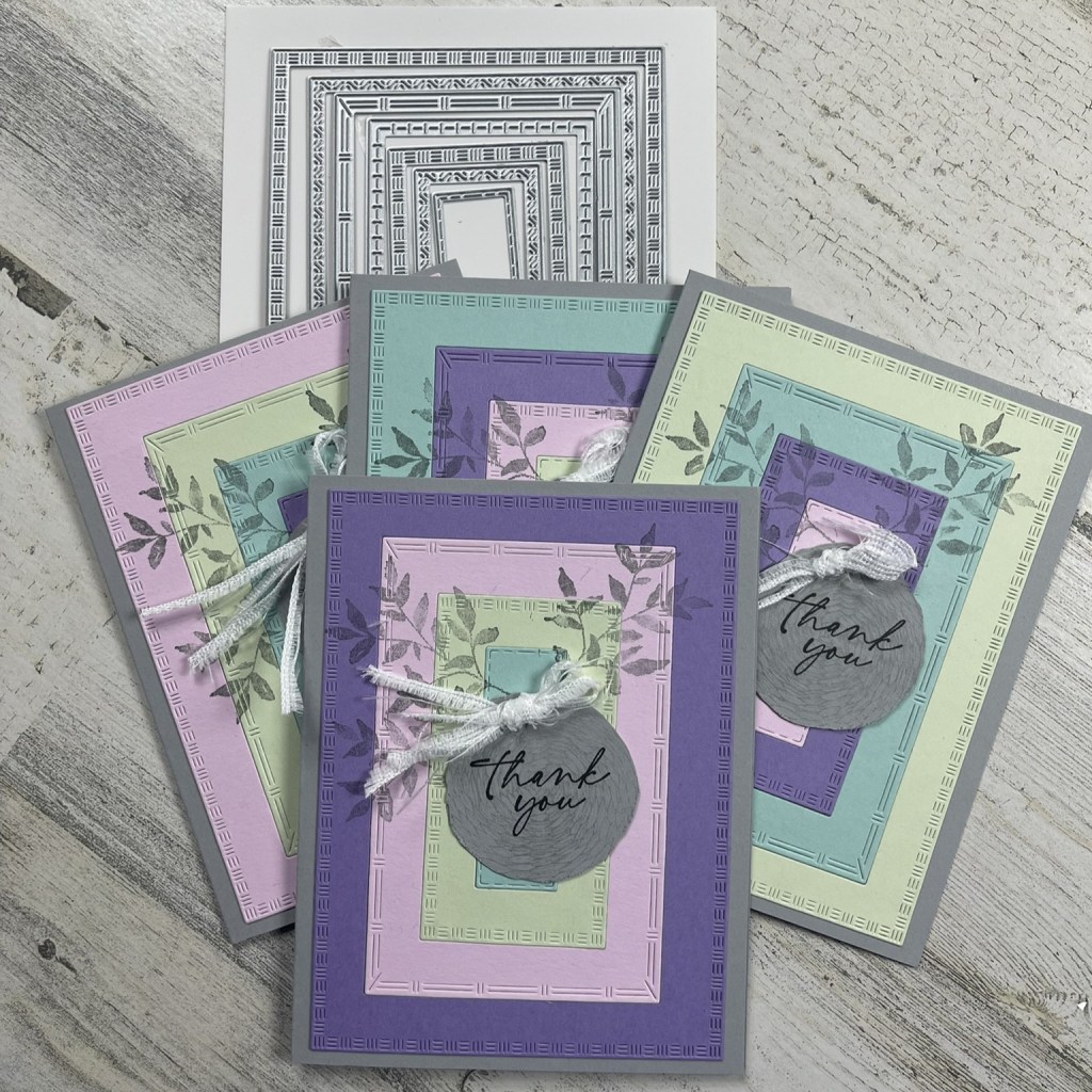 I took a few dies and layered inside of each on top of a 4 1/4″ x 5 1/2″ piece of cardstock. I then placed masking paper over the top to keep them in place and cut. I repeated this with three more colors (making sure the masking paper staid in place each time). When I was done cutting, I had enough pieces to make four cards by layering the different size cutouts I had. What a fun technique!