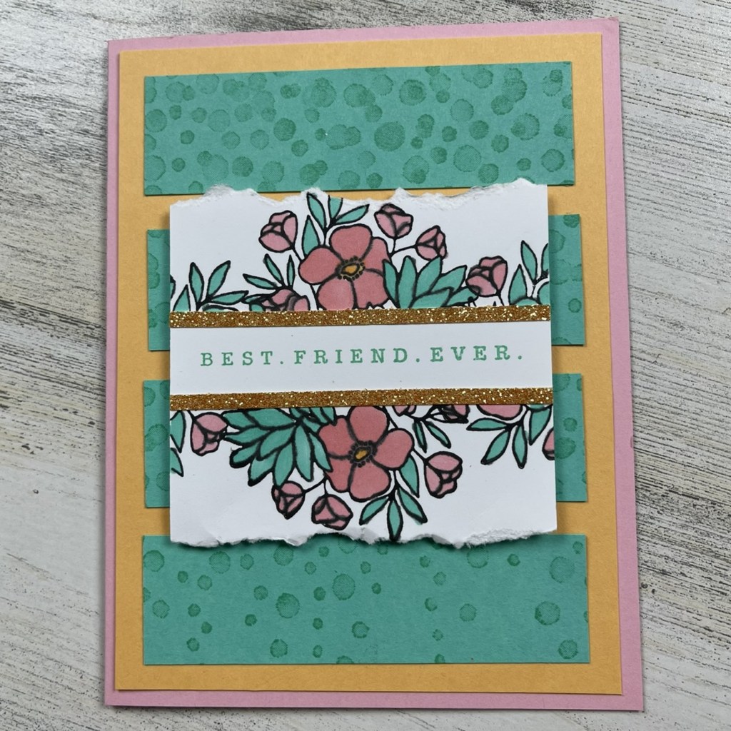 This card features the 2024-2026 InColors. The card base is 8 1/2″ x 5 1/2″, scored at 4 1/4″ on the long side. The Peach Pie layer is 4″ x 5 1/4″. I stamped a 3 1/2″ X 4″ panel of Summer Splash with the no longer available Drizzling Droplets background stamp. I cut that panel into 1″ x 3 1/2″ pieces (4 total) and adhere them to the Peach Pie panel.