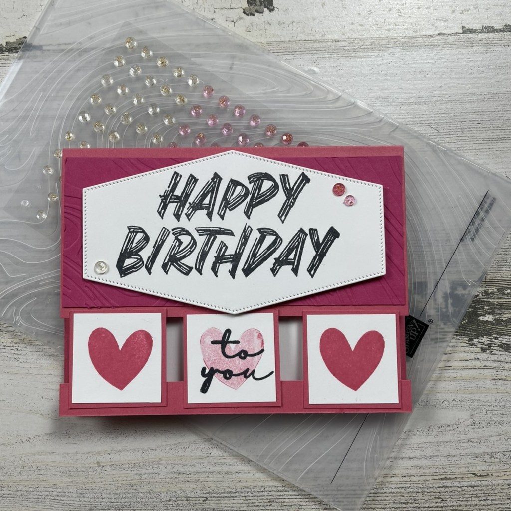 The layered Basic White pieces for the squares are 1 1/4″ x 1 1/4″. You’ll also need a larger piece of Basic White for the Happy Birthday sentiment. I dry embossed a piece of Melon Mambo (5 3/8″ x 2 3/8″) using the So Swirly Embossing Folder. The hearts from the Bee My Valentine stamp set also make an appearance.