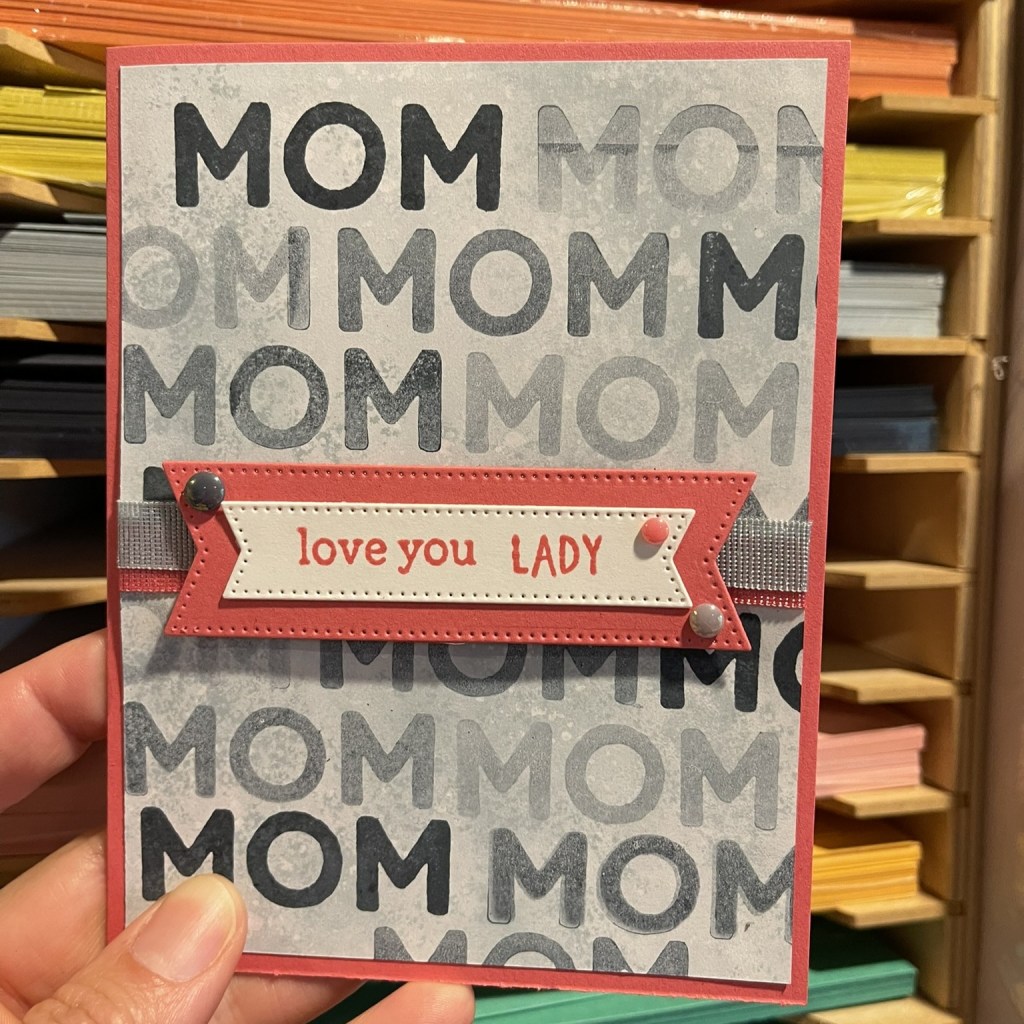 The card base is Strawberry Slush (8 1/2″ x 5 1/2″, scored at 4 1/4″). The Cloud Cover layer is cut from a piece of the Designer Series Paper pack. I cut that down to 5 1/4″ x 4″. I stamped ‘Mom’ in Secret Sea in a staggered pattern all over that Cloud Cover panel. I stamped 3 times each so that I’d have varying degrees of color.
