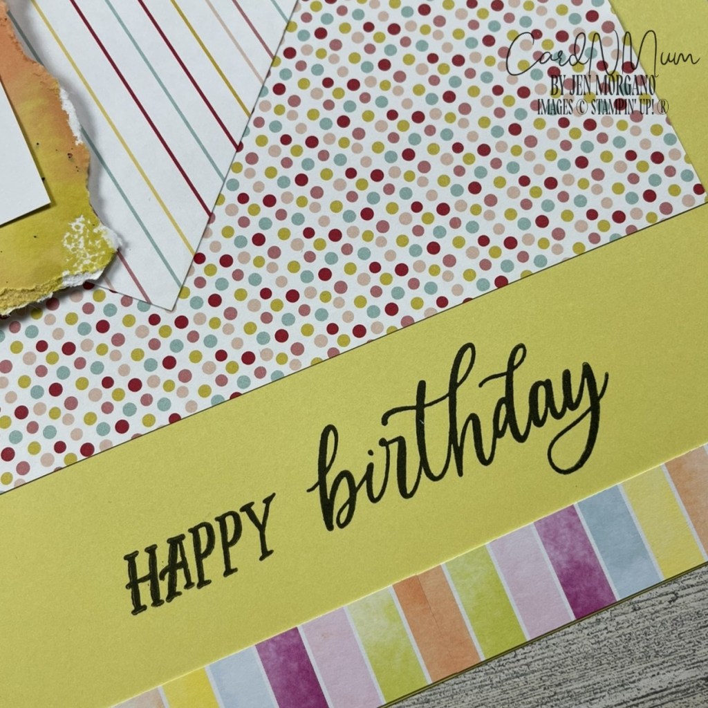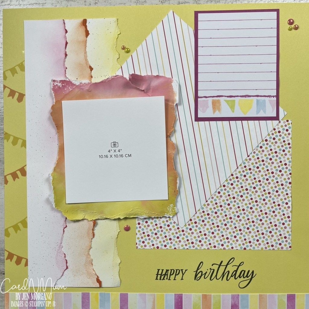 I started with a 12″ x 12″ piece of Two-Tone Darling Duckling paper. I cut a 3″ x 4″ piece from the Celebration Expressions Card Pack into 3/4″ x 4″ pieces and adhered them along the bottom of the page using liquid glue.