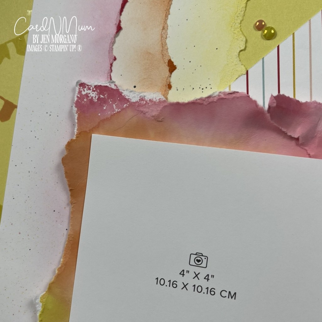 For the ‘picture’ frame and three pieces underneath, I started with a 12″ x 12″ piece of White Willow. I cut 3 pieces at 2 1/2″ x 10 1/4″(ish) off of that larger sheet. I then tore the right edges off of these pieces. I used blending brushed and Strawberry Slush, Timid Tiger, and Darling Duckling inks to blend these right edges. I then dragged (gently) the ink pads on the torn edges for some more bold color in certain areas. I then flicked my Basic Black blend brush tip inside it’s cap to get speckles on these pieces.