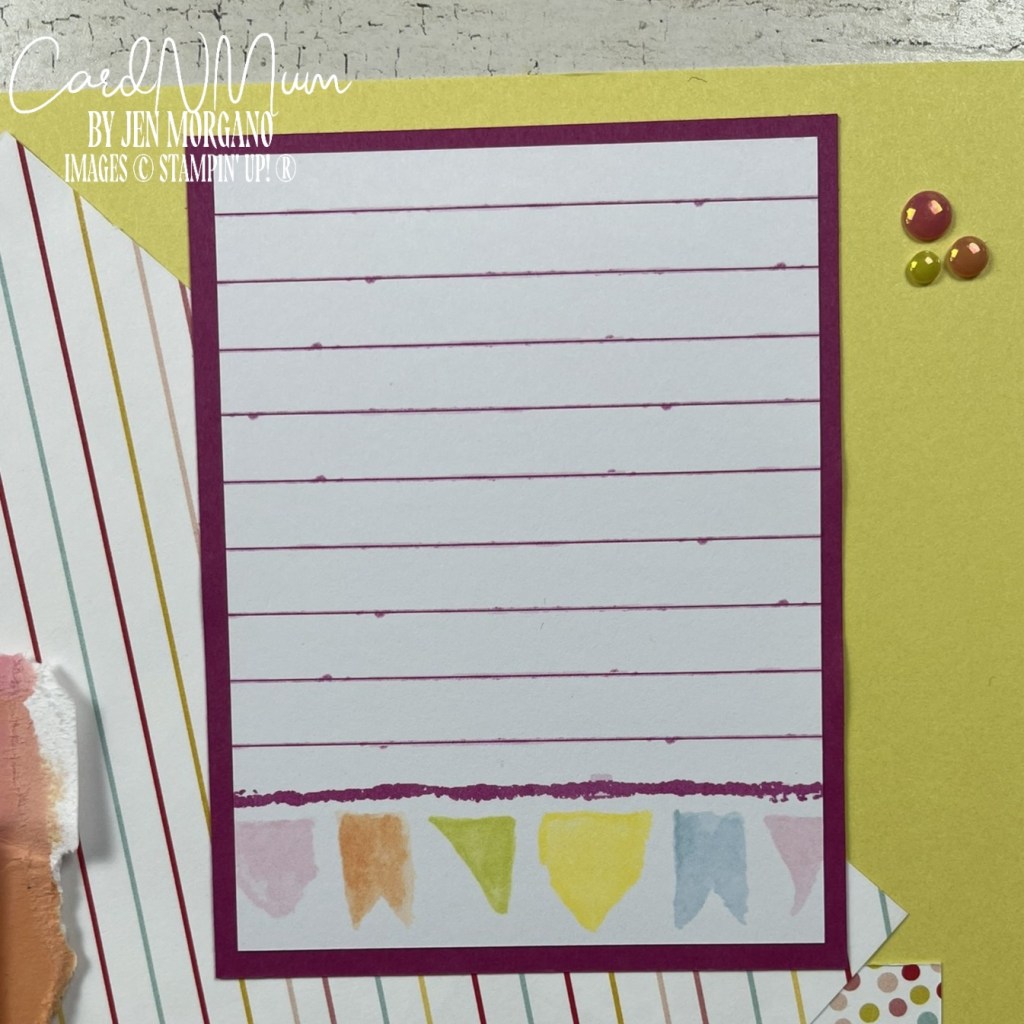 I stamped some flags on the left side of the base and then adhered my torn white pieces. I then adhered my ‘frame’ using Dimensionals. I took a lined 3″ x 4″ card from the Memories & More card pack and framed it with a 3 1/4″ x 4 1/4″ piece of Berry Burst. This was adhered to the upper right corner. I finished off this single page scrapbook layout with some InColor Flat Pearls. I love it!