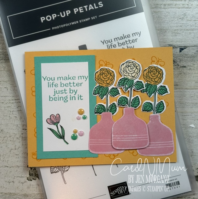 Today, I’d like to share a fun card made with the Pop-Up Petals Bundle from Stampin’ Up! This card is a little more work than the previous one I shared – but I absolutely love all of the colors and how they work together.