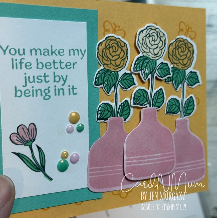 I stamped the vase image in Pretty in Pink ink on a piece of Pretty in Pink DSP (just to give it a little something extra) and then cut in out using the coordinating die. I stamped three flower images, colored them in using those awesome solid stamps, and cut out using the dies from the set. I adhered the floral stems to the back of the vases using glue. I adhered two of the vases flat on the card front and then popped up the middle one using Dimensionals.