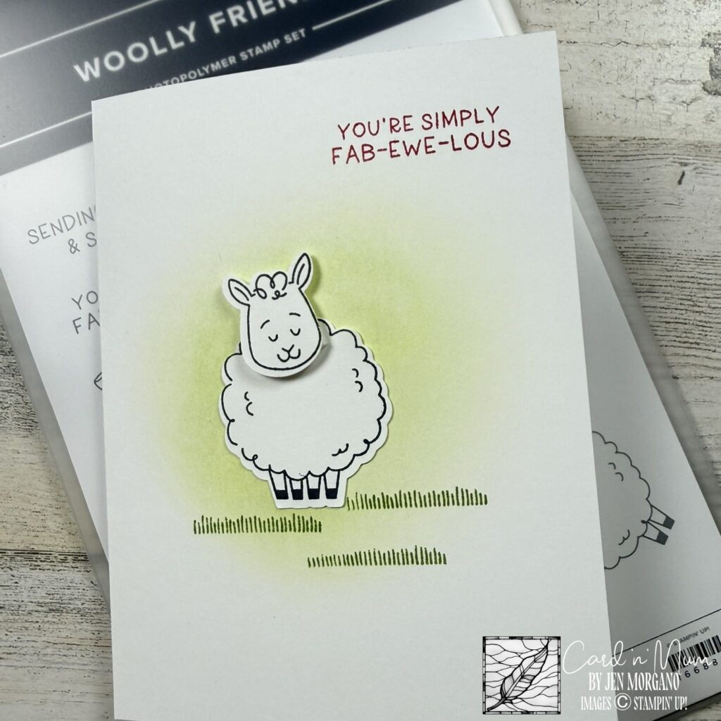 For this card, I really wanted to keep things clean and simple but still give it a soft, sweet feel. I started by adding a light blend of Granny Apple Green in the background—just enough to ground our fluffy friend without overpowering him. Then I stamped a bit of grass detail to give him somewhere to stand (because even fabulous sheep need a place to pose, right?).